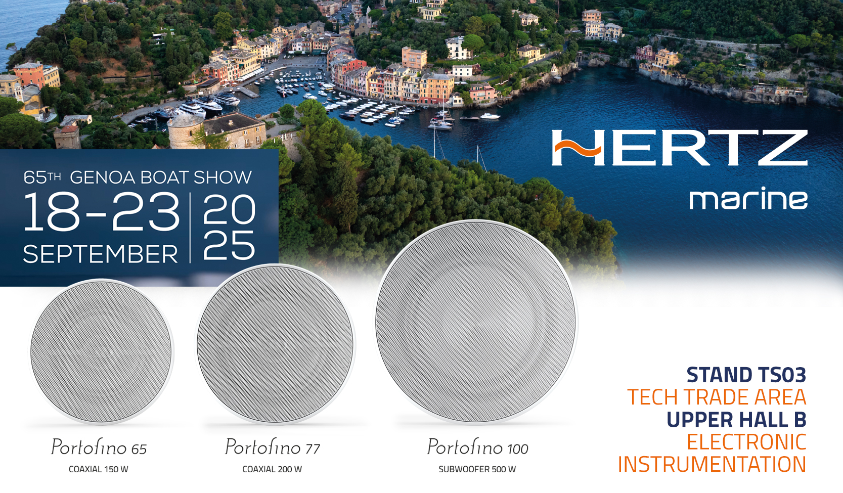 HERTZ Marine, by Elettromedia S.p.A, unveiled during the 65th Genoa International Boat Show their new Portofino line of flush-mount marine speakers, a collection created to blend premium sound performance with Italian elegance and design purity.